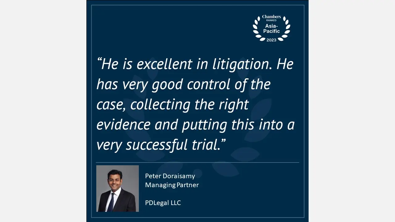 Chambers Partners Asia Pacific 2023 PDLegal LLC is pleased to announce that Managing Partner, Peter Doraisamy, has been recognised and ranked by Chambers & Partners (Asia Pacific 2023 for Shipping: Domestic: Litigation). The following quotes appear with Peter’s ranking: – “Peter Doraisamy of PDLegal in Singapore is a noted shipping lawyer in the market. He […]
